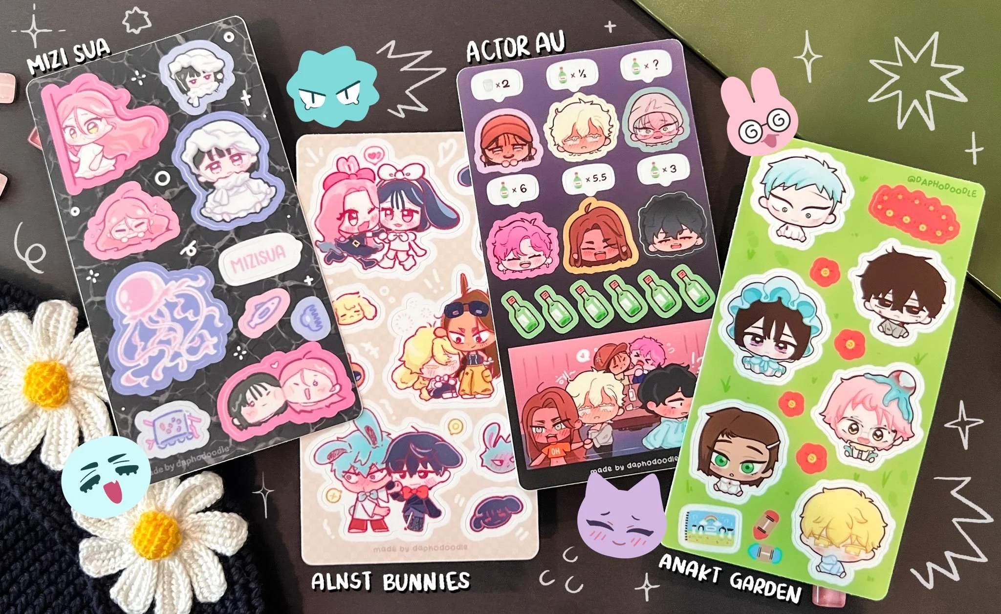 Includes: Prints, Acrylic Charms, Mugs, Plushies, Sticker Sheets/Diecuts, Glasses Clothes, Glasses Cases, Wooden Rice Spoons, Wooden Coasters, Phone Grips, Handheld Mirrors and more!